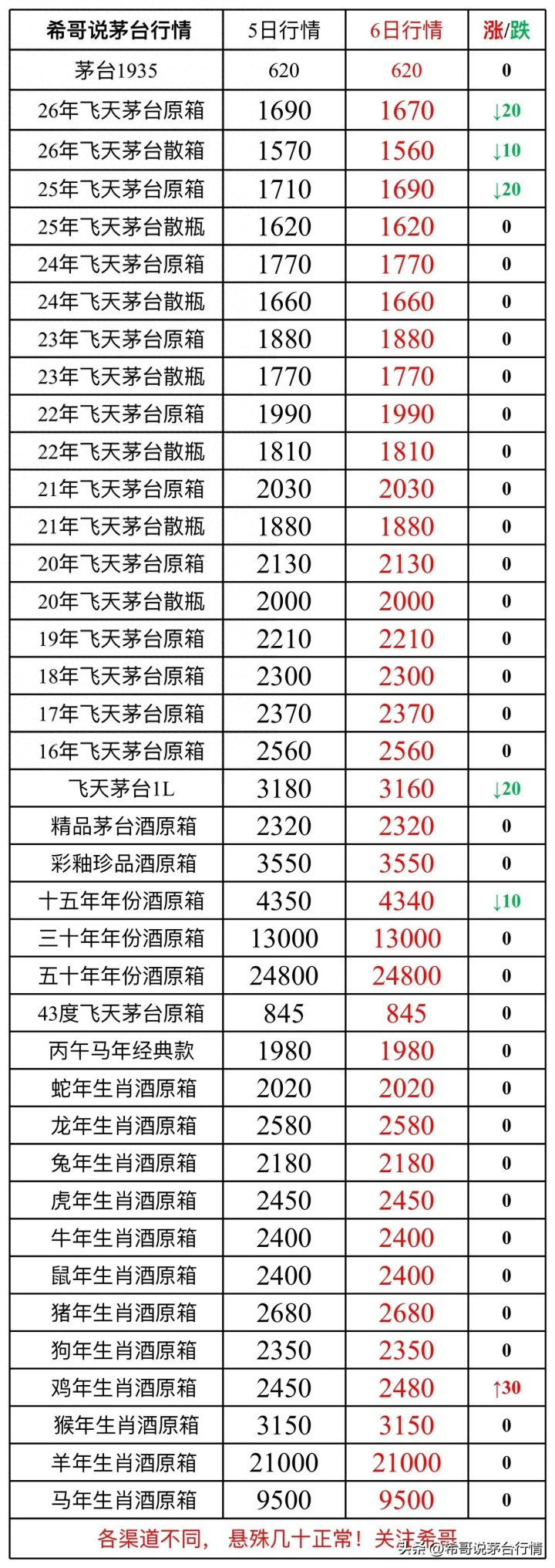 4月6日鸡年生肖独涨、新飞天等5款核心品下跌,是茅台淡季极致分化的典型表现——生肖稀缺性兑现、新飞天获利回吐、大规格脉冲修正,价盘韧性充足、无系统性风险。短期看分化延续、新飞天磨底,中长期核心资产价值依然稳固。